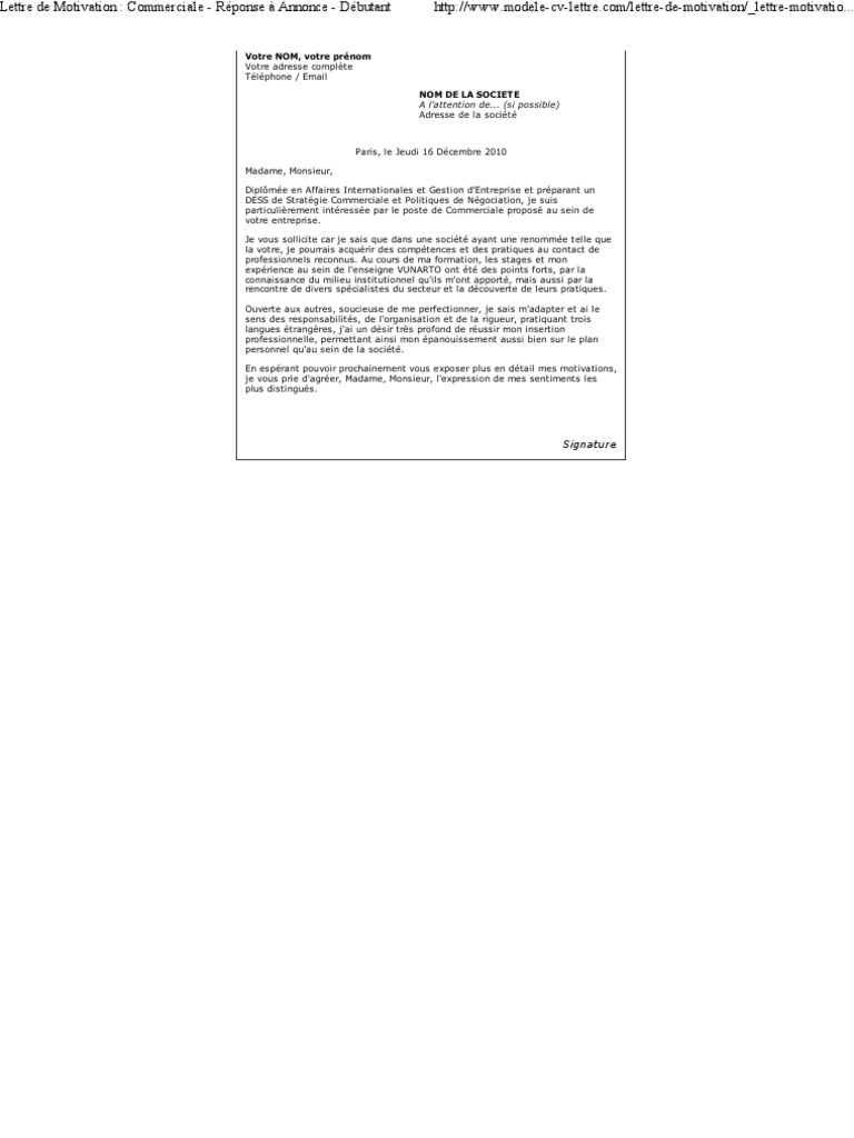 Nom, prénom adresse téléphone email. La lettre de candidature vous permet de vous présenter auprès d'une entreprise. Exemple lettre de motivation accompagnateur de personnes à via www.qapa.fr. Offres d'emploi de lettre motivation account manager pour trouver l'emploi que vous cherchez. Enrichissement des tches, besoin de reconnaissance, dsir de participer. Vous avez trouvé sur notre site l'exemple de lettre qui conviendra au poste à pourvoir et vous vous apprêtez à l'envoyer aux recruteurs ? Manager internationneles lettre motivationnel exemple. Modèle de lettre de motivation pour un poste de community manager. Key account manager junior (intern) france (paris. Le modèle est téléchargeable en bas de page. Motivational letters for job and university application. Voici comment, idéalement, doit s'articuler votre lettre de motivation. Par exemple, une revendication d'ordre salarial cache souvent d'autres attentes non satisfaites :